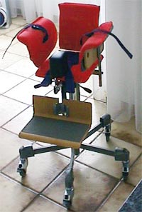 Schon bald erhielt Gilles auch die ersten Hilfsmittel, die es ihm erlaubten, mehr Freiheiten auszukosten und die Therapien weiter zu entwickeln. So erhielt er mit ca. 18 Monaten einen speziellen Therapiestuhl, in dem er selbständig sitzen kann. Das positive an diesem Stuhl ist, dass Gilles hier gut abgestützt ist und trotzdem mit seinen Händen den vollen Aktionsraum ausnutzen kann. Dieser Spezialstuhl wächst auch mit ihm, so, dass er ihn auch heute noch problemlos benutzen kann. | |||