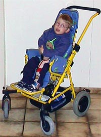 Gilles Problem – und auch das Problem von uns – ist seine Mobilität. Gilles kann sich auch heute nur robbend fortbewegen. Er hat zwar noch ein Hilfsmittel, mit dem er sich im Hause selbständig fortbewegen kann, aber dies wird erst später beschrieben, weil er es auch erst mit 4 Jahren erhielt. Als wir Gilles von der Grösse und Gewicht her nicht mehr einfach in den normalen Buggy setzen konnten, erhielt er im Alter von 3 Jahren einen speziellen Kinderbuggy. Dieser ist für alle hilfreich. Dies ist ein Hilfsmittel, das ihn auch stützt und dafür sorgt, dass er beim Sitzen die Beine in der richtigen Stellung hat. Damit können wir Gilles beinahe überall hin mitnehmen und die Höhe dieses Hilfsmittels ist so eingestellt, dass er auch in einem Restaurant auf den Tisch sehen und auch Speisen und Getränke vom Tisch nehmen kann. | |||